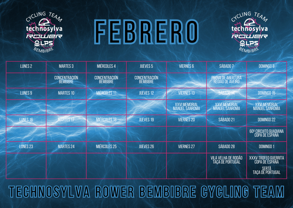 La actividad competitiva se intensificará a partir del domingo 22 de febrero, fecha en la que el Technosylva Rower Bembibre Cycling Team iniciará su participación en la Copa de España élite-sub23, como es tradición, en el Circuito del Guadiana. Apenas una semana después, el equipo volverá a Portugal para arrancar la Taça de Portugal, compitiendo en las pruebas de Vila Velha de Ródão y Sertã, mientras que ese mismo domingo disputará la segunda cita de la Copa de España, el XXXV Trofeo Guerrita.